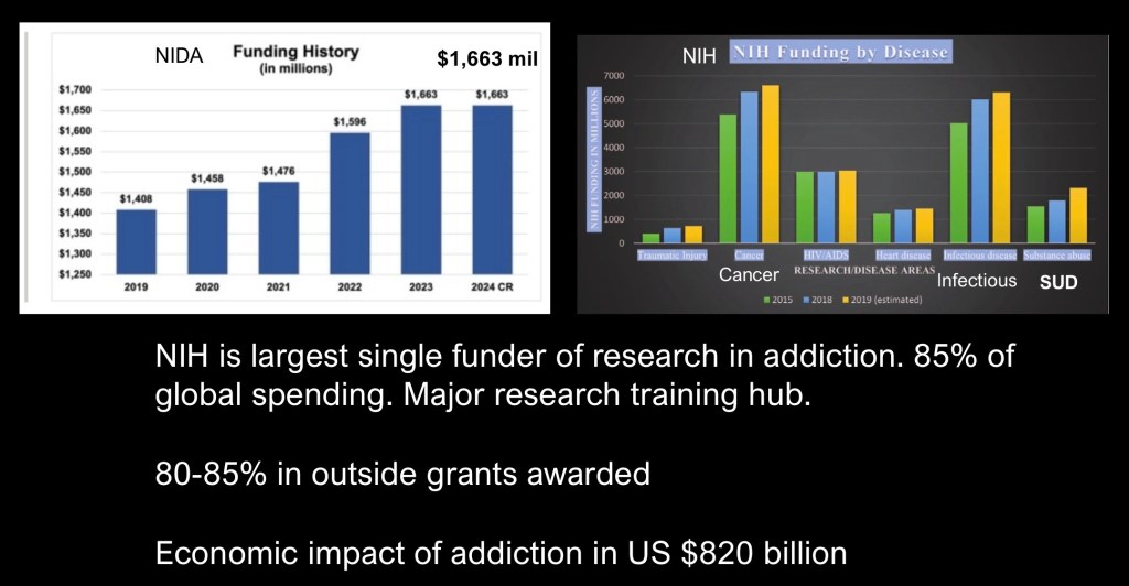 The NIH is the largest single funding source for research into SUD in the world and the US is the global leader in the field and in training of new research scientists. The NIDA has a current annual budget of $1.6 billion. The economic cost in the US attributed to alcohol and drug abuse in $820 billion per year.