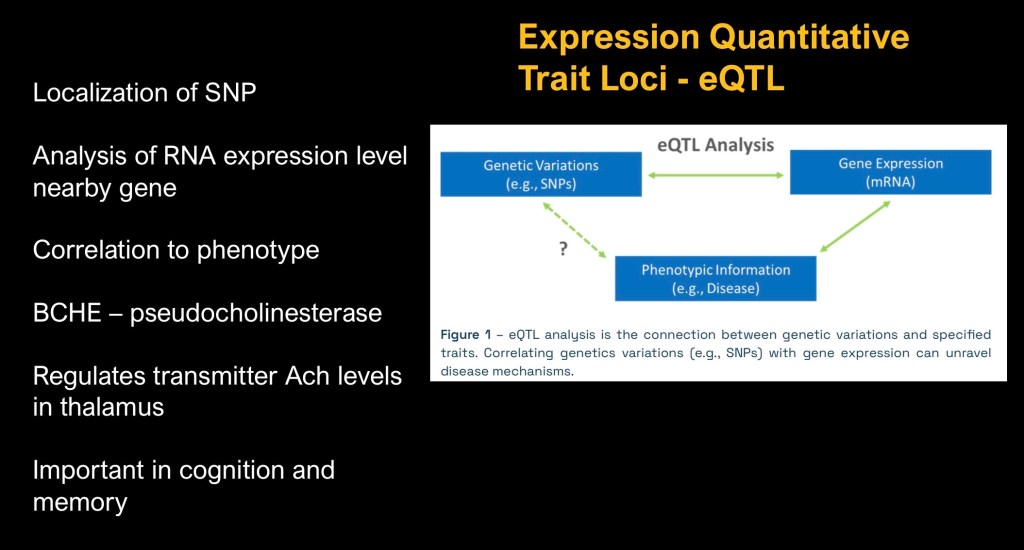 Expression Quantitative trait localization (eQTL) analysis was performed at this location. The method analyzes gene expression by measuring RNA production at associated genes. Decreased expression of the gene coding for the protein pseudocholinesterase (BCHE) located just upstream of the SNP identified. eQTL allows for quantitative correlation of cellular activity with expressed traits such as memory or behavior.