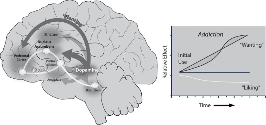 - “Wanting” and “liking” depend on separate mechanisms within the brain, which can become uncoupled.
