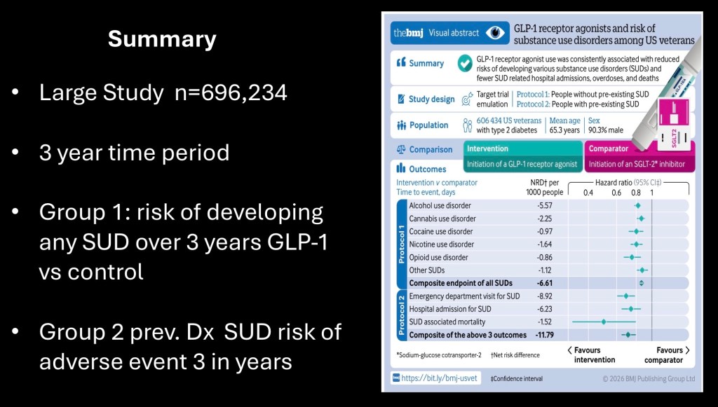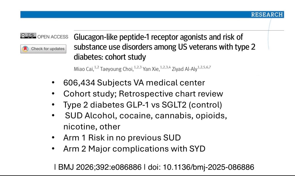 Cai M, Choi T, Xie Y, Al-Aly Z. Glucagon-like peptide-1 receptor agonists and risk of substance use disorders among US veterans with type 2 diabetes: cohort study. BMJ. 2026 Mar 4;392:e086886. doi: 10.1136/bmj-2025-086886. PMID: 41781010; PMCID: PMC12958796.