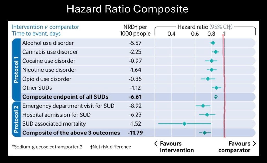 For example HR of 0.8 for cocaine represents 20% less chance of developing Cocaine use disorder in the GLP-1 treated group.